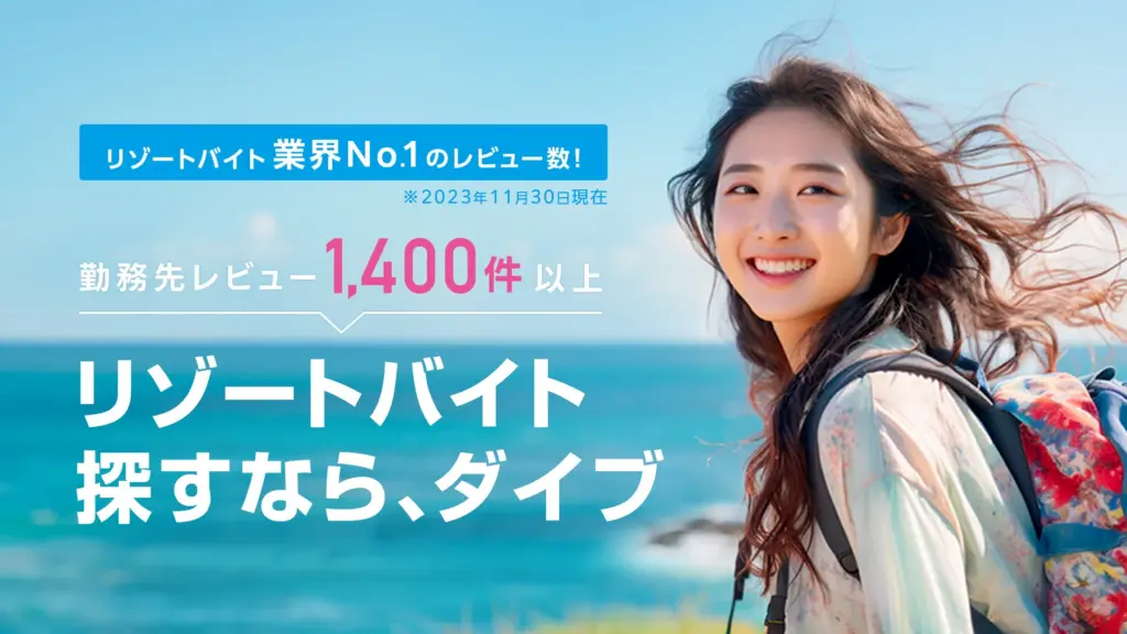 ダイブ は、リゾートバイト業界の中でも 若年層・未経験者に特に人気のある大手派遣会社です。テレビCMやWeb広告などで名前を見かけたことがある人も多いのではないでしょうか。知名度が高く、初めてリゾートバイトに挑戦する人からの支持が厚い派遣会社です。